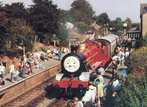 | 鉄道発祥の地でもあるイギリスでは鉄道を大切に思う人々が、蒸気機関車 をもう一度走らせたいと、保存運動を行い、今でも数多くの蒸気機関車が実 際に走っています。その鉄道は保存鉄道とよばれ、元鉄道員や鉄道ファン のボランティア活動により支えられており、その数は、イギリス国内で 数百ケ所以上にものぼります。 その保存鉄道では、トーマスの原型となった蒸気機関車そのものが、 映像に登場する“トーマス”のイメージに作りかえられたものもあり、客車 を引いて元気に走り、トーマスが訪れるイベントのときには、小さな子供 から、老人のファンまで、世代をこえた数多くの人々が集まります。 |