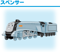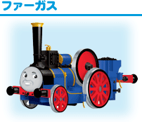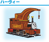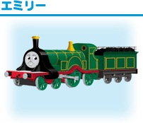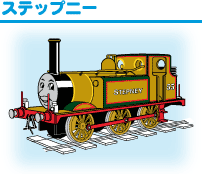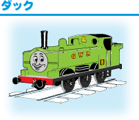| 新品のタンク機関車。貨車の入れ替えやコンテナを運ぶのが仕事。 | ボディが長く、動輪が10個もついた強そうで大型の蒸気機関車。 | ソドー島で働く小さな鉄道用牽引車。少々口うるさいけど仕事熱心。 |