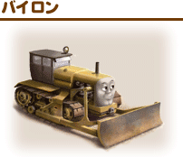 | 農場で働いているトラクター。キャタピラーが付いていて、どんな道でも走れます。 | 道路工事が仕事のスチームローラー。機関車をバカにしています。 | 工事の仕事を手伝いに来たホイールローダー。 |