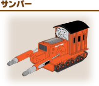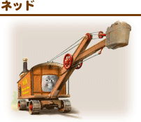 | ちょっとらんぼうなダンプカー。 | 蒸気ショベルカーのネッドは、ボディーは大きいけれど気は小さいみたい。 | クレーンのクランキーはソドー島いちのっぽ。港で船の荷物の積み下ろしをしています。 |