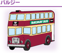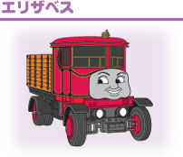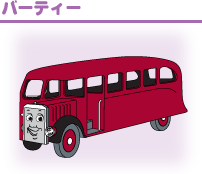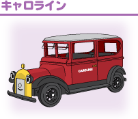 | トーマスとどちらが速いか競争したこともあるバスのバーティー。今は大の仲良しです。 | 2階建てバスのバルジーはいばりんぼう。ある日橋につかえて動けなくなってしまいます。 | キャロラインは赤いボディの自動車。でもあまり速く走ることができません。 |
